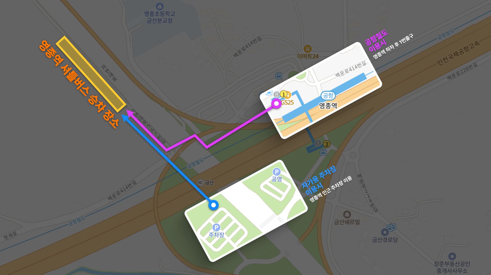 - 자가용: 영종역 인근 주차장 이용 -> 셔틀버스 탑승 -> 씨사이드파크 송산공원 도착